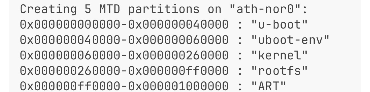 arg 5: mtdparts=ath-nor0:256k(u-boot),128k(uboot-env),2048k(kernel),13888k(rootfs),64k(ART);ath-nor1:16M(opt)