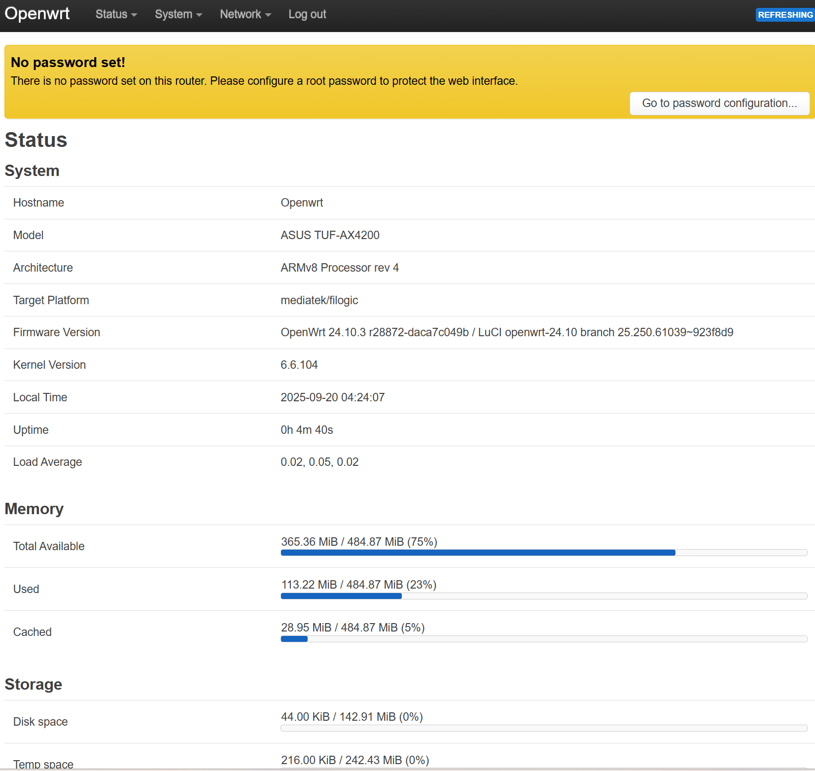 I’m running OpenWrt 24.10.2 on an Asus RT-AX4200 (Filogic 830). WAN/LAN link shows 2.5 Gbps, but speed tests top out at ~1 Gbps.