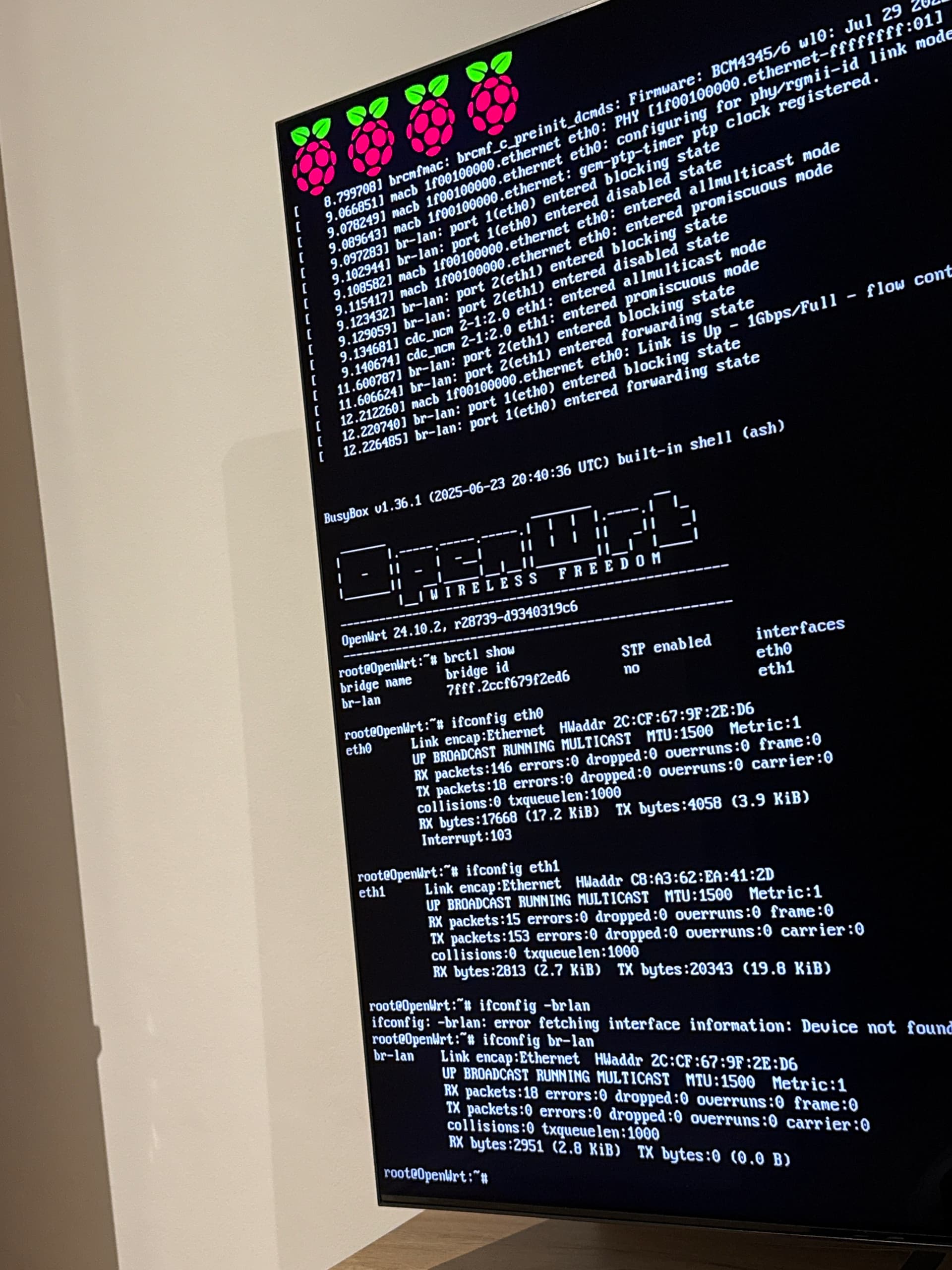 Could you please stop posting photos of your monitor but proper text output, please? Maybe use the Wi-Fi of the Pi as an access point so you can connect to your Pi via SSH before you’re plug in your network cables.