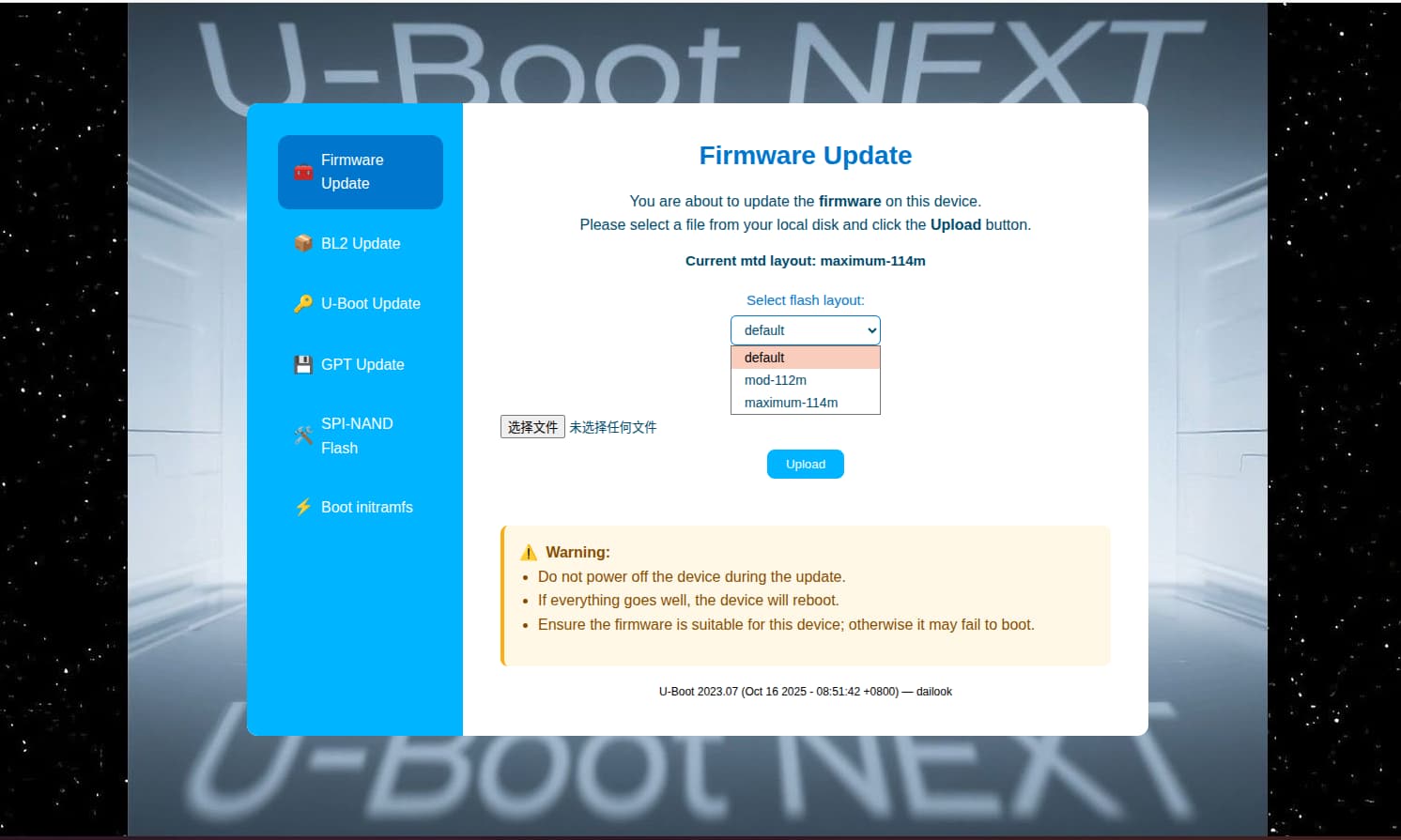 3. Upload the *squashfs-sysupgrade.bin image.