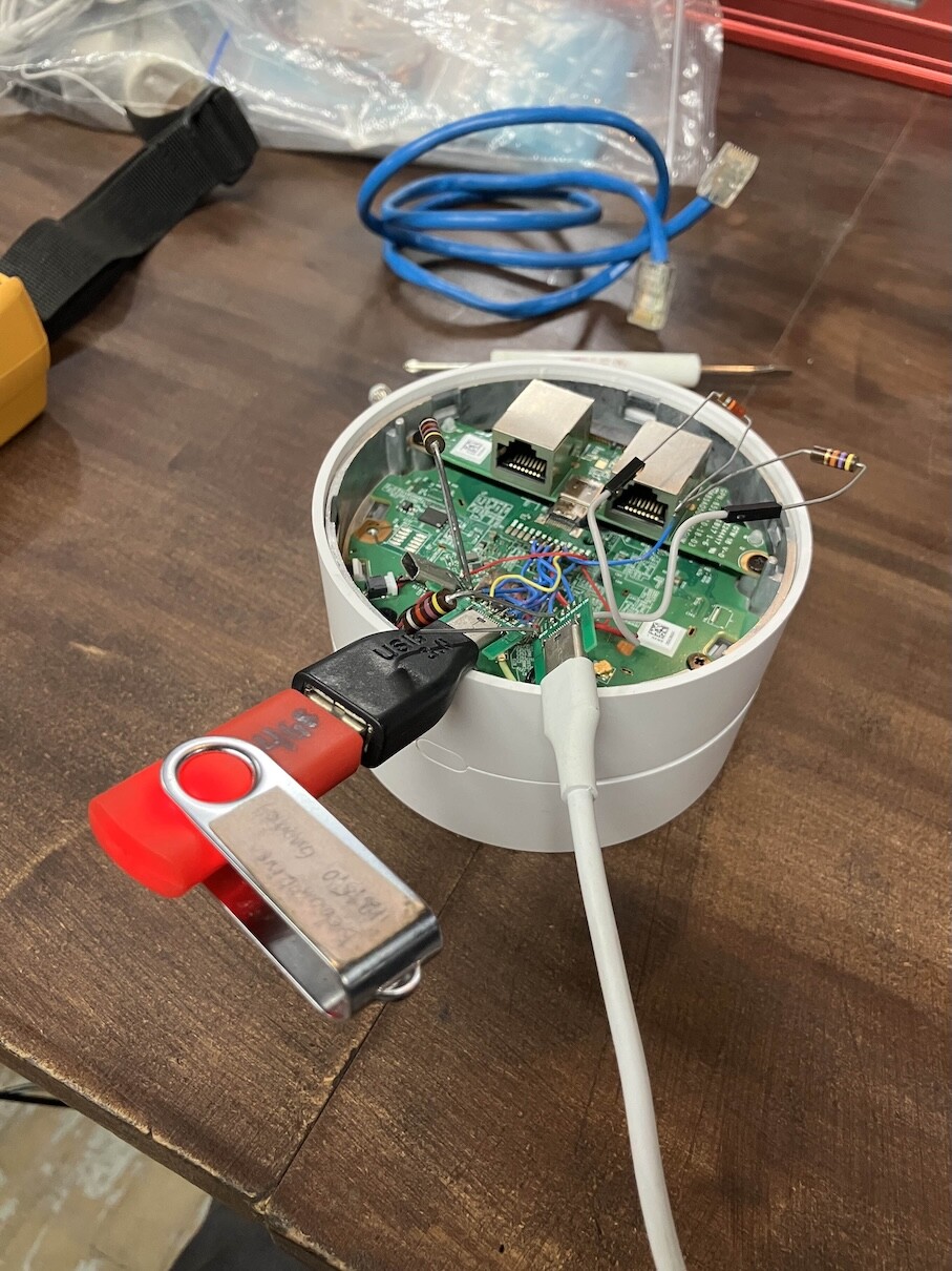 Attempt #2: building a SuzyQ cable so that I can see serial output. Spent a long time trying to build this and it wasn’t working, took weeks to realize the USB-C breakout board that I got had incorrect pin labels (reversed), like some others have reported here. In the end, I was able to get serial output. Then I wanted to attach the USB-C hub and look at serial output why it couldn’t boot openwrt. I had the Google wifi CC1/CC2 serial lines still set up for CCD (56 kOhm/22 kOhm), and the hub’s CC line down using a 5.1 kOhm, and this convinced the hub to supply power. But then I think its default data role is “host” and the Google wifi wasn’t reading the flash drive at all anymore. Switching data roles requires a full PD negotiation, which was too much for me. Good information on USB-C and power/data roles in this Texas Instruments - An Engineer's Guide to USB Typе-С. Anyway, I gave up on the USB-C hub. I still don’t know why this USB-C hub is “incompatible”.