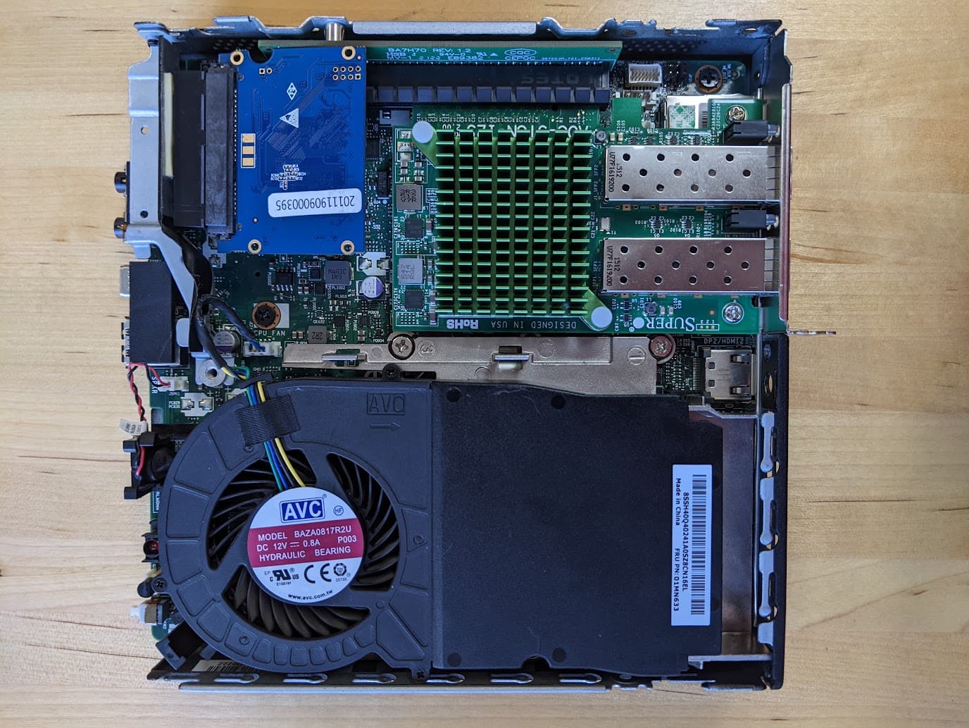 The eagled-eyed among the readers probably recognized the chassis; yes, it’s a Lenovo M720q Tiny. The network interface card is a 10-gig dual-port SFP+ Supermicro AOC-STGN-I2S (aka Intel 82599, aka ixgbe). The little blue board in the top left corner of the photo is a 64 GB slim SATA SSD, held in place by a strip of double-sided construction tape (I’ll think of a better mounting solution eventually; there might be a way to integrate the SSD into the NIC cooling solution I bought from Untrusted Source).