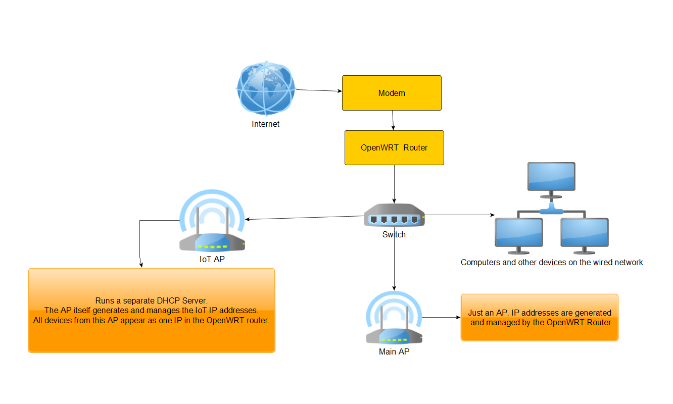 I'm pretty new to OpenWRT and its features and I'm kinda stuck on this one. At home i have a lot of IoT devices. I want them to keep them isolated from the main network. I have them all connected to one Router/AP. Here is a picture that explains how my network is set up:
