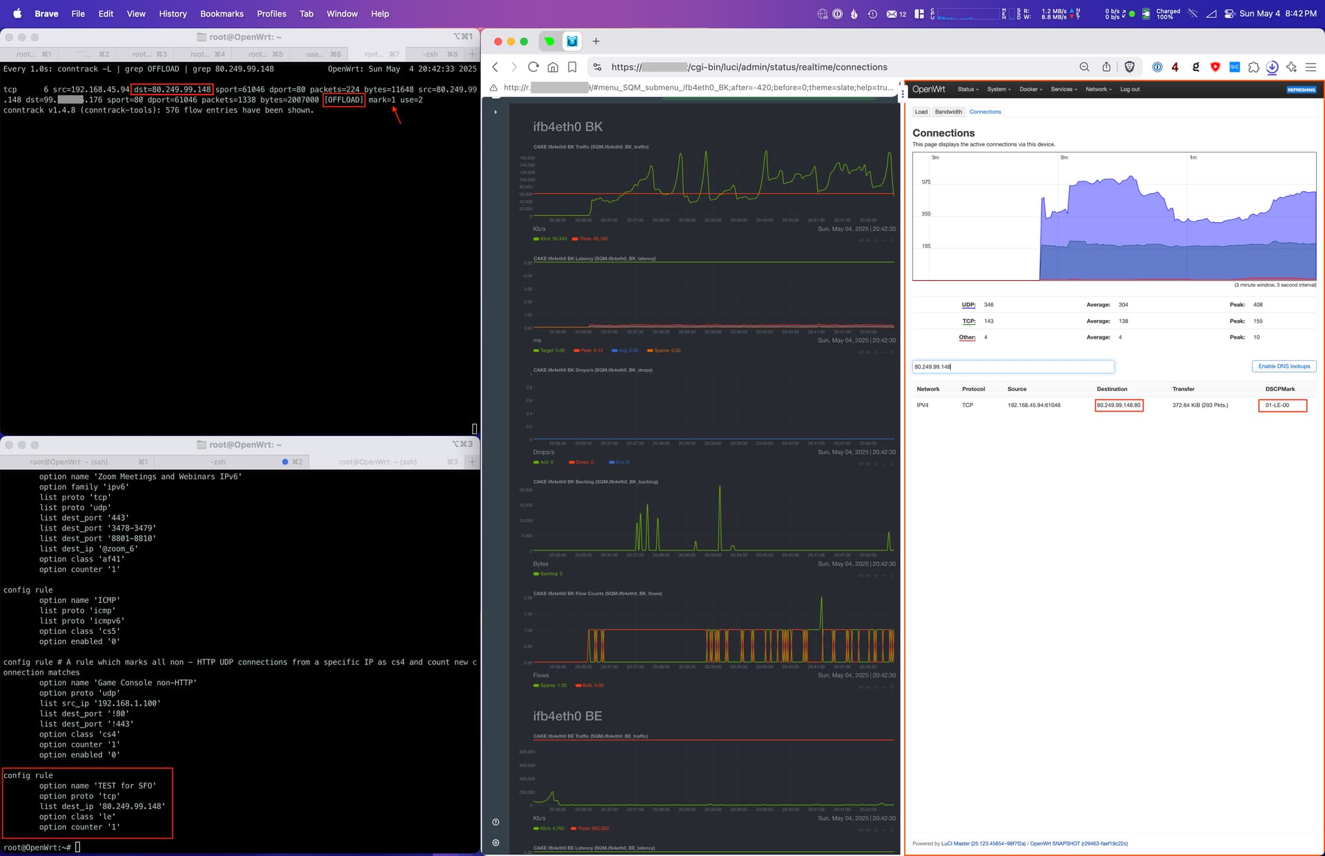 I kicked off the download and confirmed the connection between my test machine and the destination IP (80.249.99.148) was offloaded via SFO (see top-left window in the screenshot). In the browser window in the right of the screenshot, I simultaneously had Netdata showing the BK tin and also OpenWrt web UI showing the connection and corresponding DSCP value (01-LE