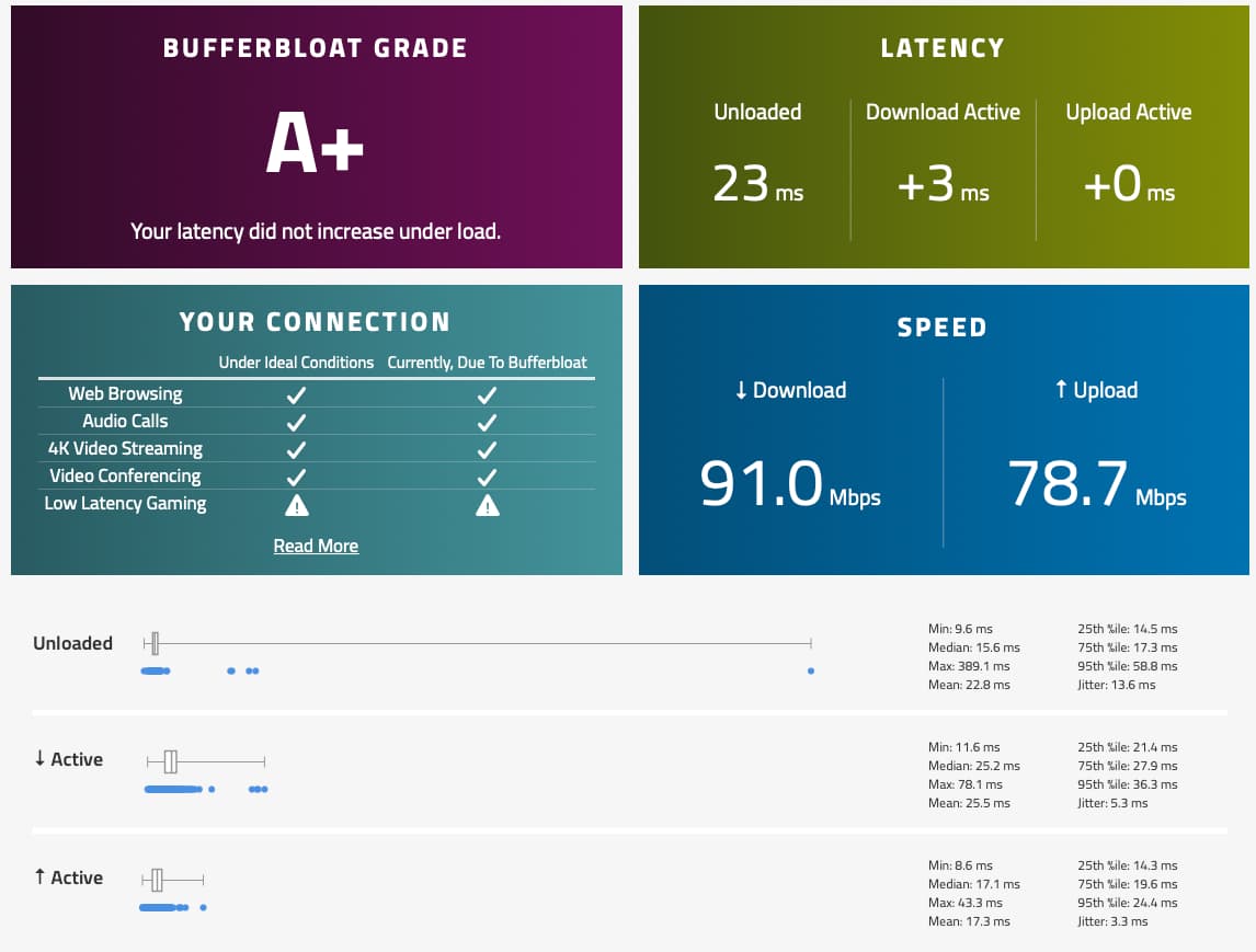 I think I need to get in touch with my ISP about the advertised 500Mbit/s speed I'm getting. But I don't really understand why via WiFi I get better results in battling buffer bloat then via Wired when the up-/download limits are higher.